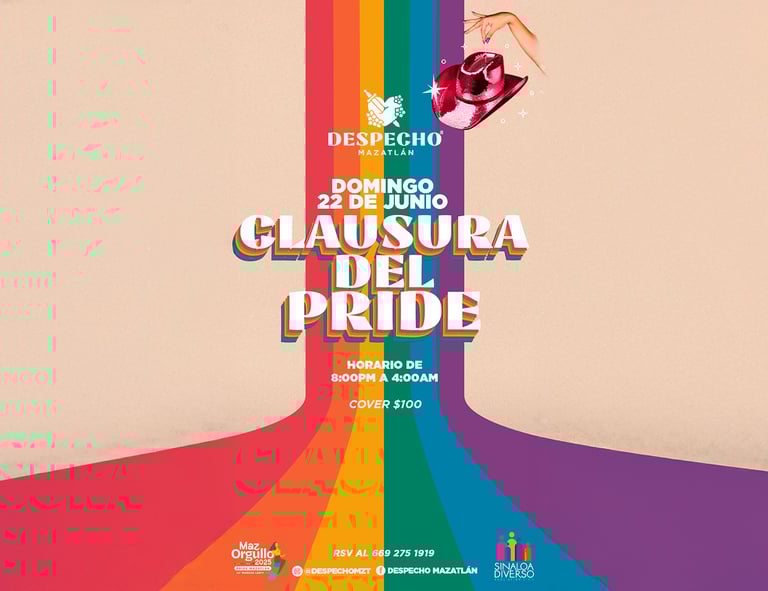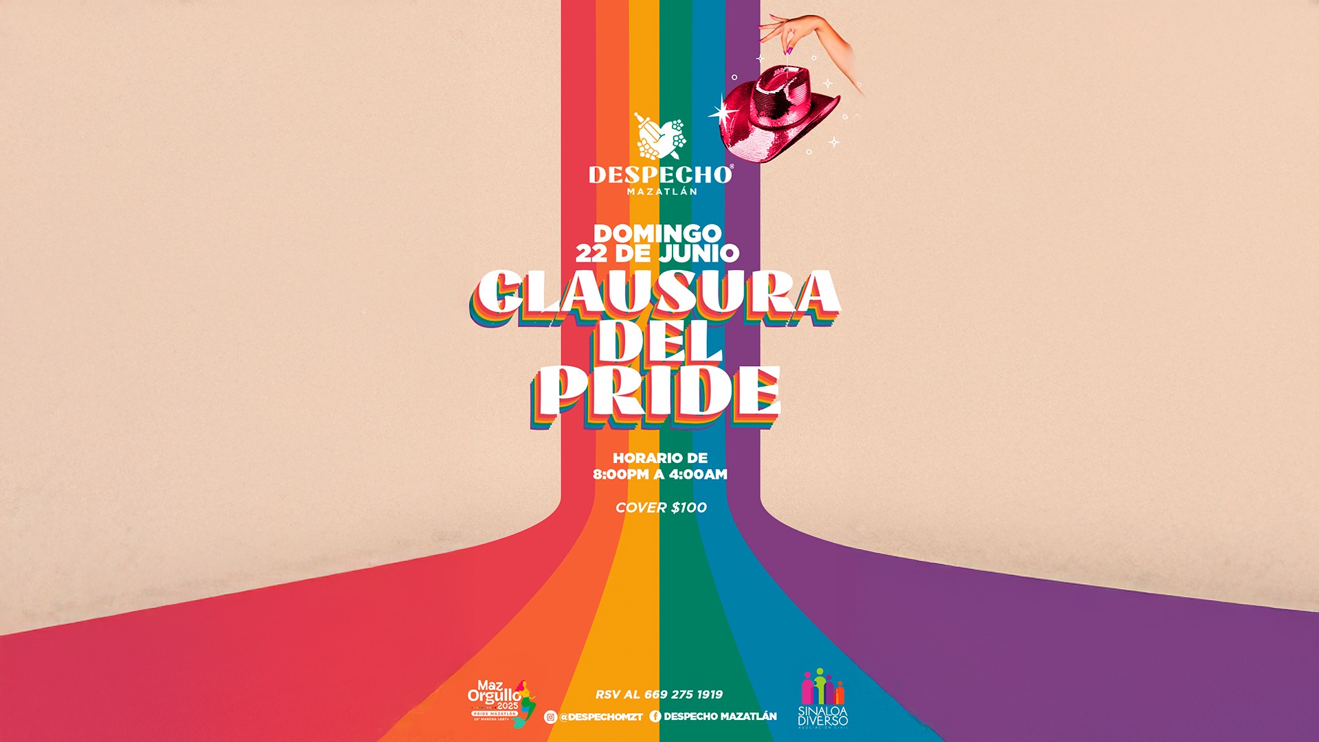 Después de marchar, celebrar y resistir… ¡es momento de cerrar con todo! Te esperamos este domingo 22 de junio en El Despecho, desde las 8:00 p.m. hasta las 4:00 a.m., cover $100, en la fiesta oficial de clausura del Pride Mazatlán.