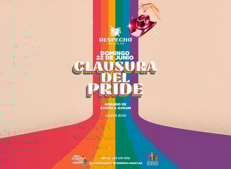 Te esperamos este domingo 22 de junio en El Despecho, desde las 8:00 p.m. hasta las 4:00 a.m., cover $100, en la fiesta oficial de clausura del Pride Mazatlán.